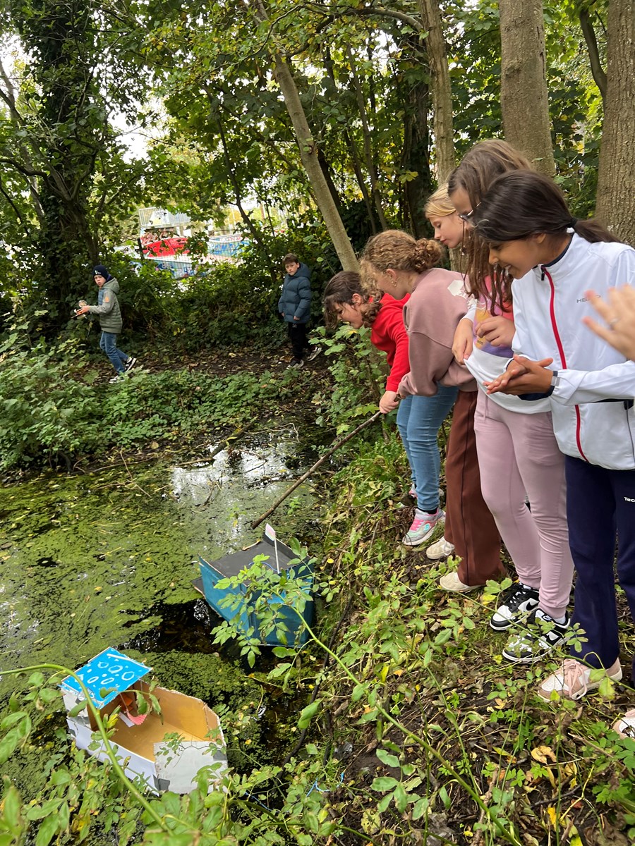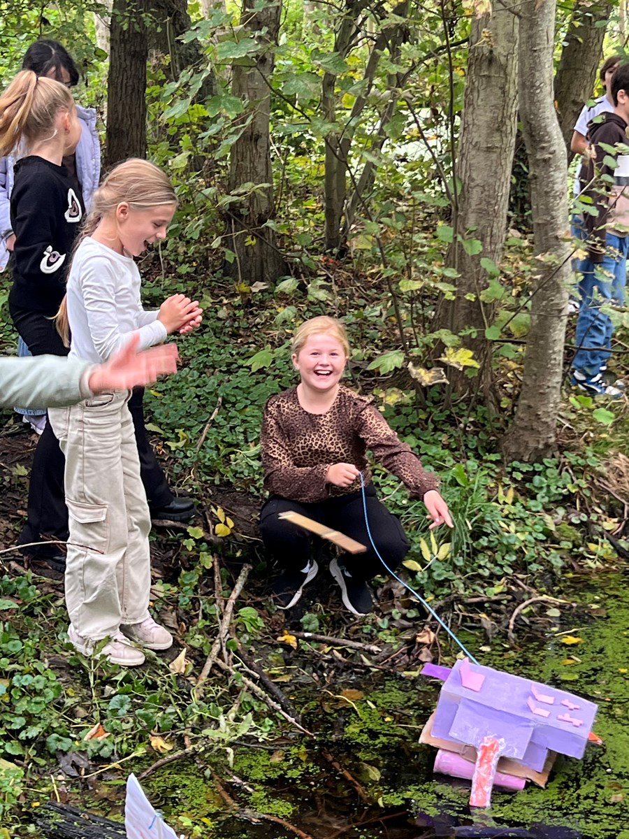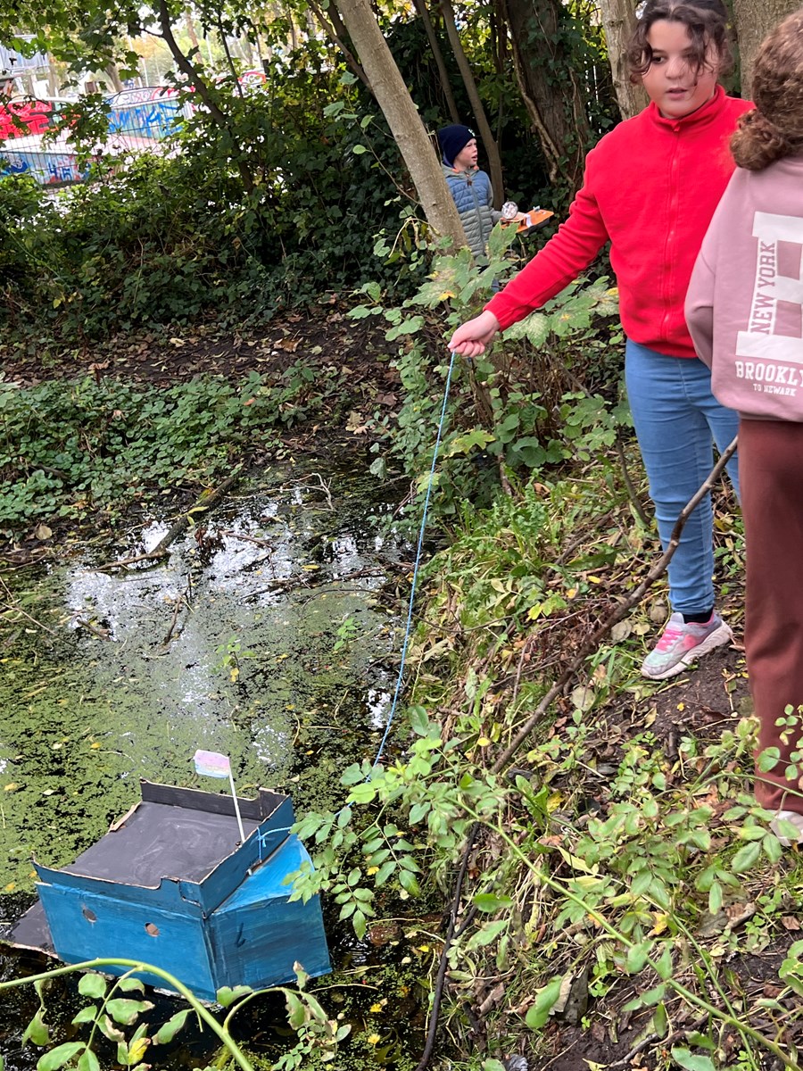 In groepjes bouwden de kinderen hun eigen schip: van zeilboten tot piratenschepen en cruiseschepen. Daarbij dachten ze na over materiaalgebruik, evenwicht en drijfkracht — en gisteren kwam het grote moment: de proefvaart op de eendenvijver!