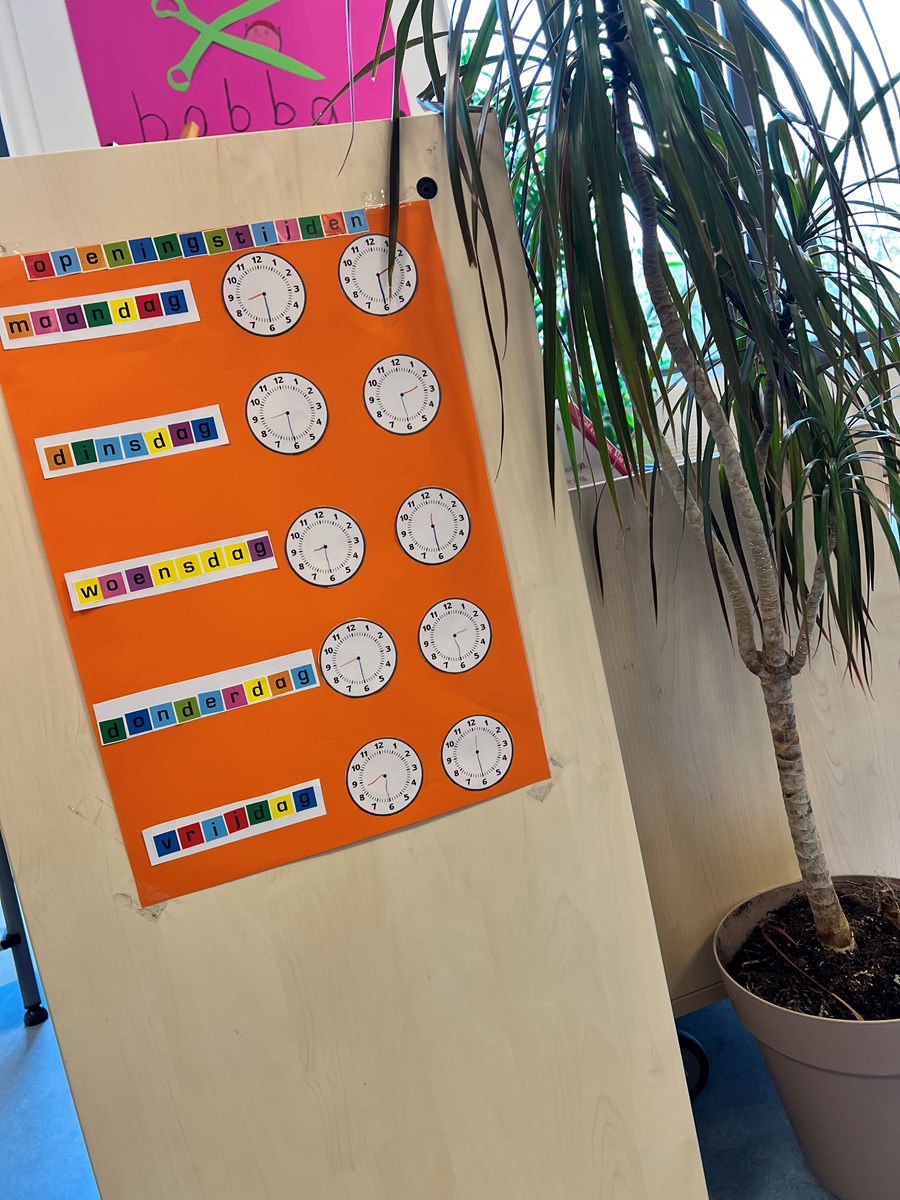 Tijdens rekenen leerden we klokkijken op hele en halve uren. Dat kwam goed van pas bij het maken van openingstijden voor onze kapsalon, want klanten willen natuurlijk niet voor een dichte deur staan!