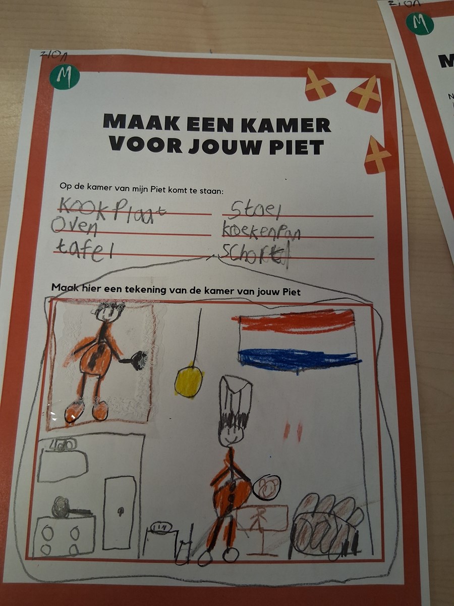 We maken allemaal een kamer voor het Pietenhuis. We schrijven eerst op wat onze Piet met zijn kamer wil: Er ontstaat een machinekamer, een keuken of een stal! De kinderen bedenken zelf hoe ze de voorwerpen in de kamer vormgeven. En het wordt zo mooi!
