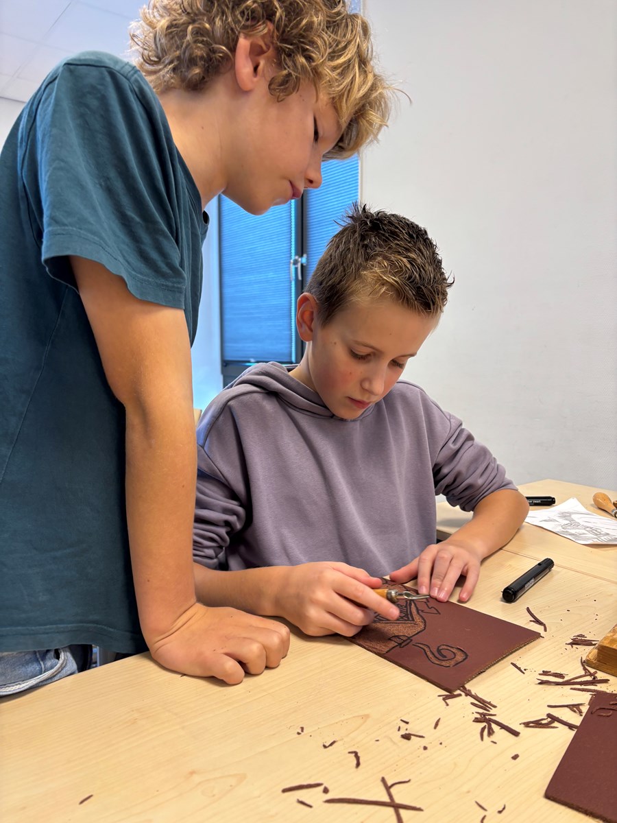 Er hing een ontspannen sfeertje in de klas en iedereen was lekker aan het gutsen. Soms even een bot mesje, waardoor het heel zwaar was, maar die konden snel vervangen worden. Veel kinderen vonden het geweldig!