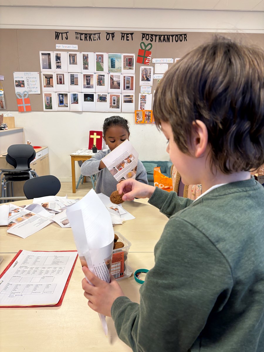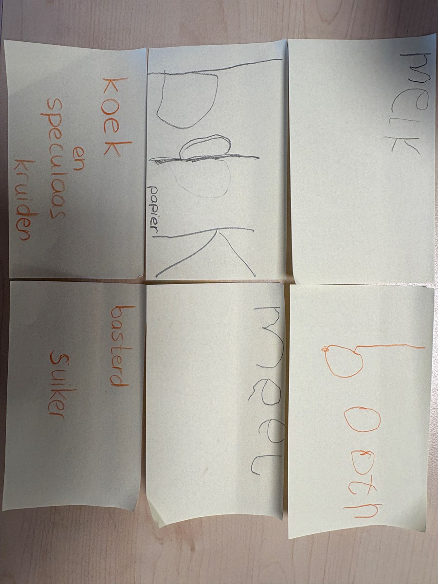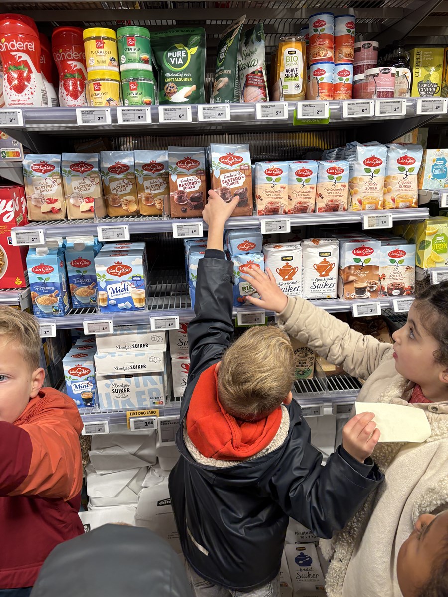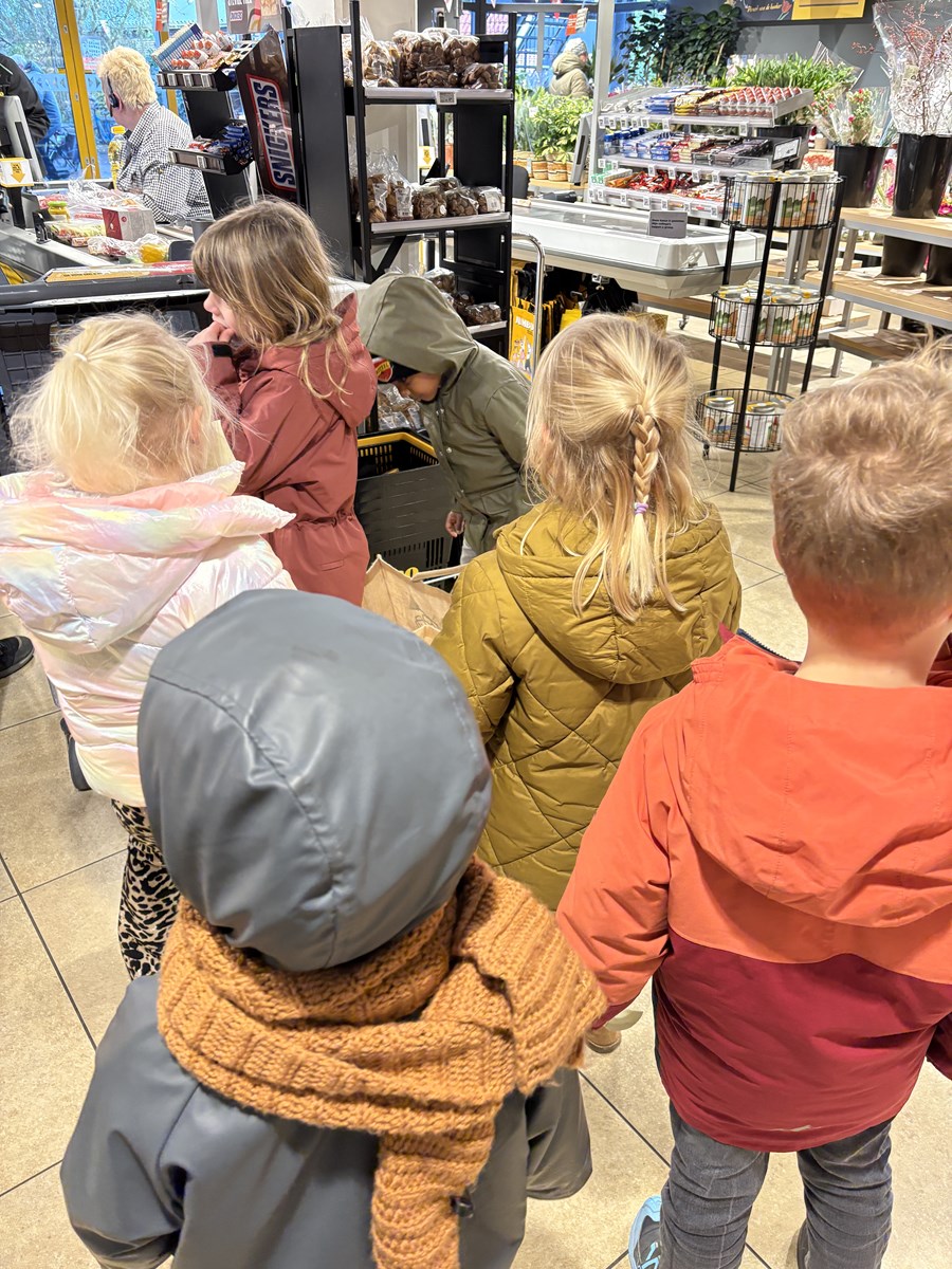Afgelopen maandag werd er bij andere scholen pepernoten gebakken. Dat vonden de kinderen zo lekker ruiken, dat zij ook graag pepernoten wilden bakken. Dus werd er een recept gezocht en goed bekeken en gelezen. Daaruit kwam ons boodschappenlijstje naar voren. Het speelgeld werd uit de portemonnee gehaald en het echte geld ging erin. We konden vertrekken naar de supermarkt. In de winkel gingen we op zoek naar de verschillende ingrediënten. Deze werden in het boodschappenmandje gelegd en daarmee gingen we naar de kassa. Alles werd keurig afgerekend. Op de terugweg werden de huizen nog even goed bekeken. We ontdekten dat de huisnummers niet netjes op een rij staan. Maar er is een even en oneven kant. Toen we dat hadden ontdekt konden we wel de telrij opzeggen, maar moesten we steeds even naar de andere kant van de straat kijken om het volgende cijfer te ontdekken.