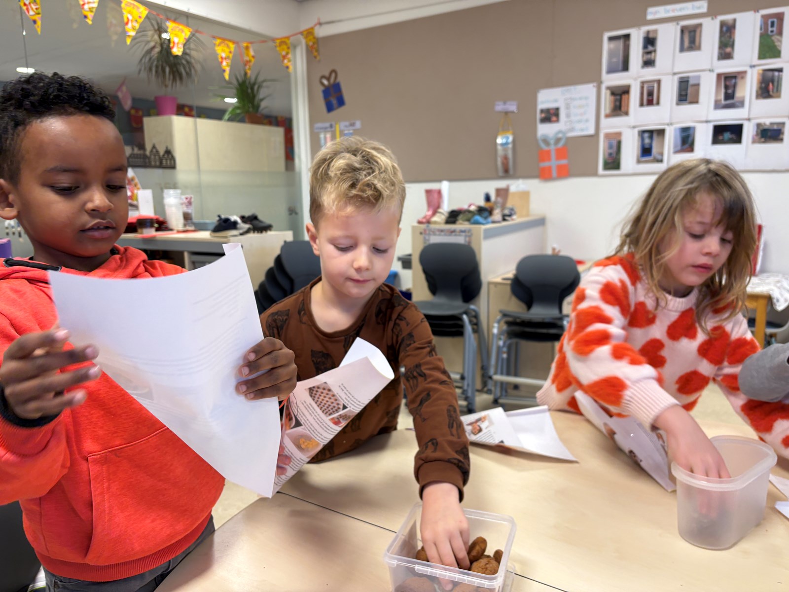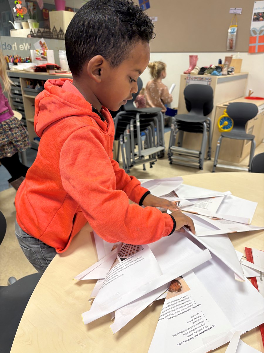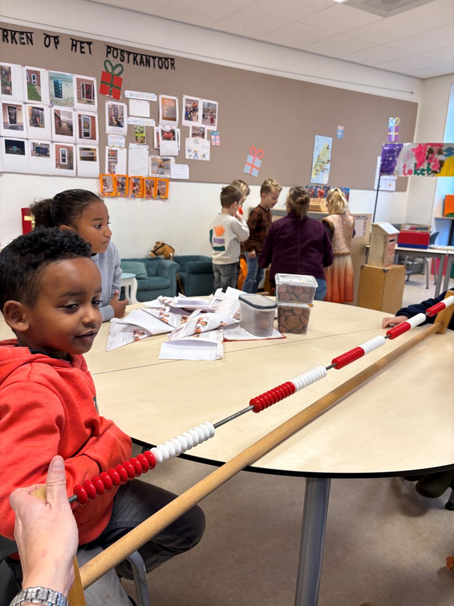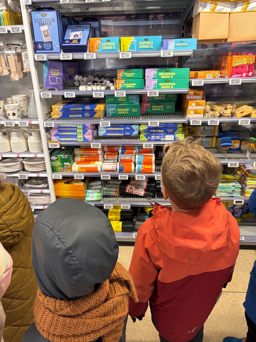 Afgelopen maandag werd er bij andere scholen pepernoten gebakken. Dat vonden de kinderen zo lekker ruiken, dat zij ook graag pepernoten wilden bakken. Dus werd er een recept gezocht en goed bekeken en gelezen. Daaruit kwam ons boodschappenlijstje naar voren. Het speelgeld werd uit de portemonnee gehaald en het echte geld ging erin. We konden vertrekken naar de supermarkt. In de winkel gingen we op zoek naar de verschillende ingrediënten. Deze werden in het boodschappenmandje gelegd en daarmee gingen we naar de kassa. Alles werd keurig afgerekend. Op de terugweg werden de huizen nog even goed bekeken. We ontdekten dat de huisnummers niet netjes op een rij staan. Maar er is een even en oneven kant. Toen we dat hadden ontdekt konden we wel de telrij opzeggen, maar moesten we steeds even naar de andere kant van de straat kijken om het volgende cijfer te ontdekken.