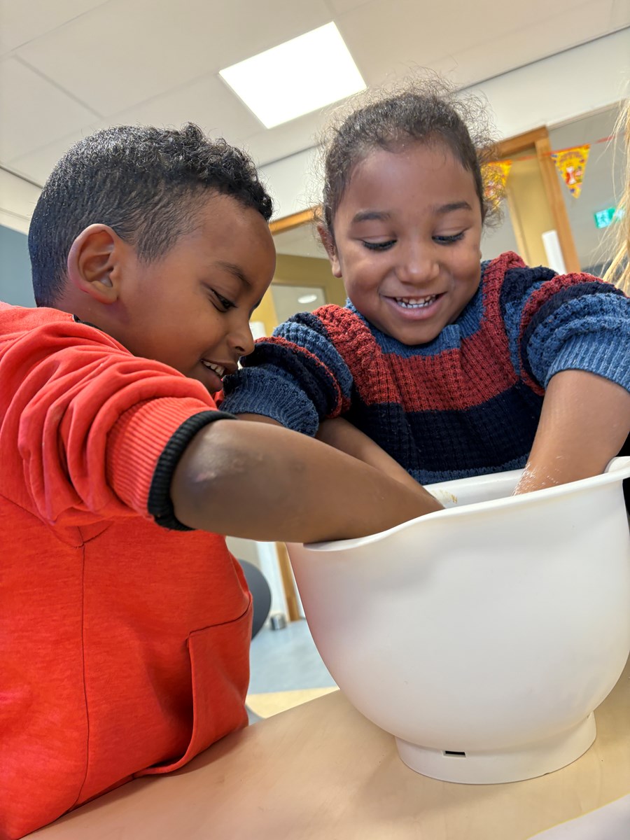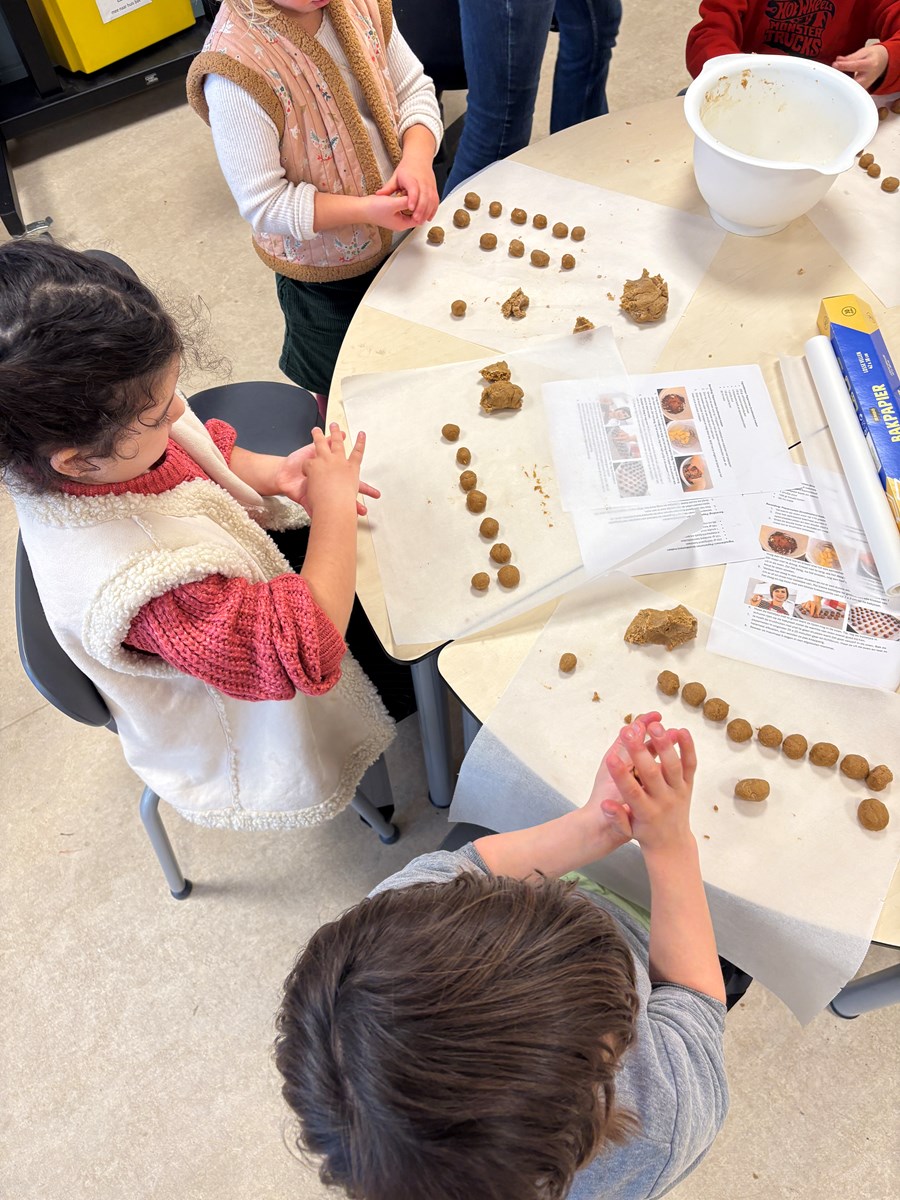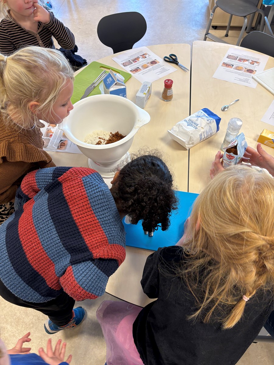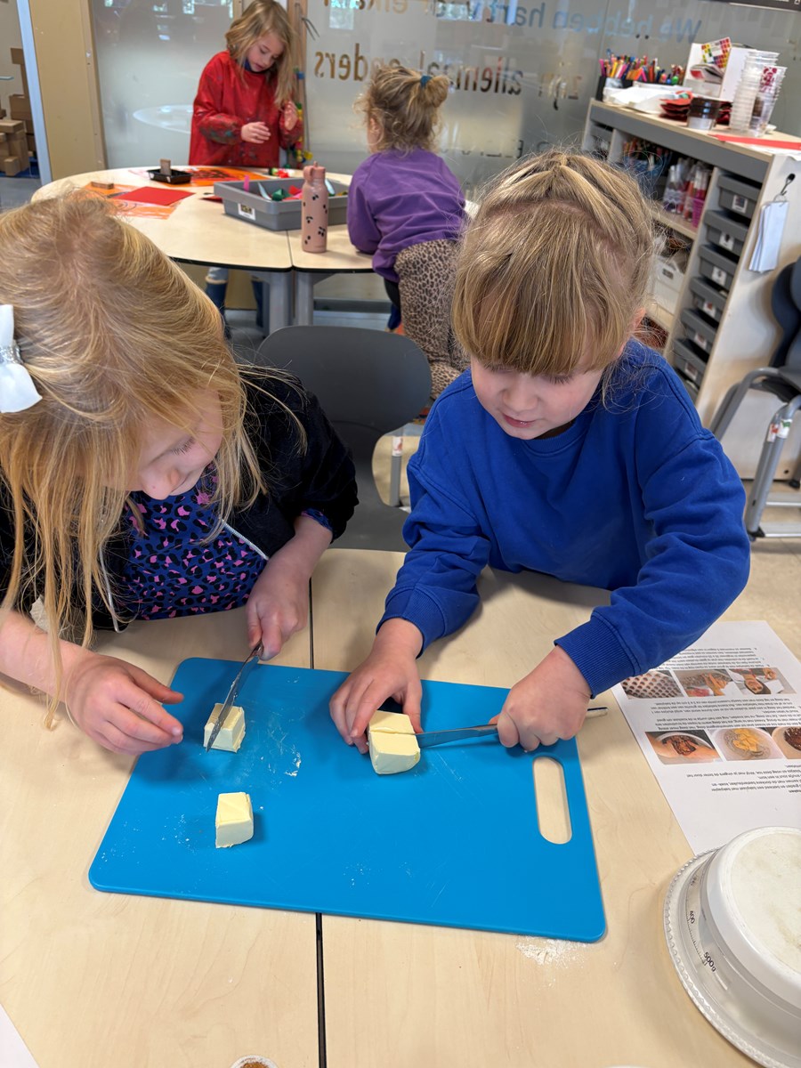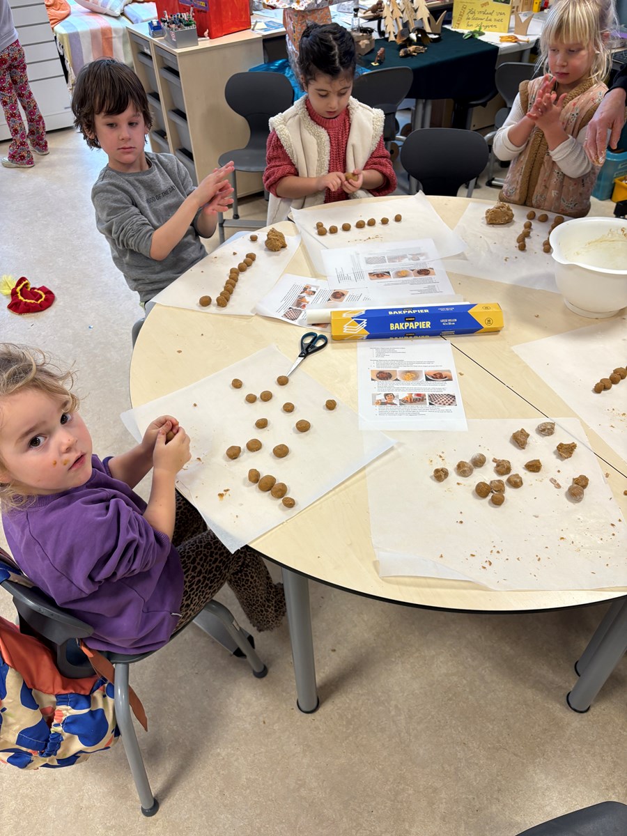 Terug op school gingen we weer verder met het maken van het deeg. Er werd gemeten en gewogen. Maar het leukste en vieste klusje was wel het kneden van het deeg. Hoe langer we dit deden, hoe meer het van onze vingers afging en het een mooi bolletje deeg werd. Alle kinderen konden komen pepernoten rollen en daarna: bakken maar!!!