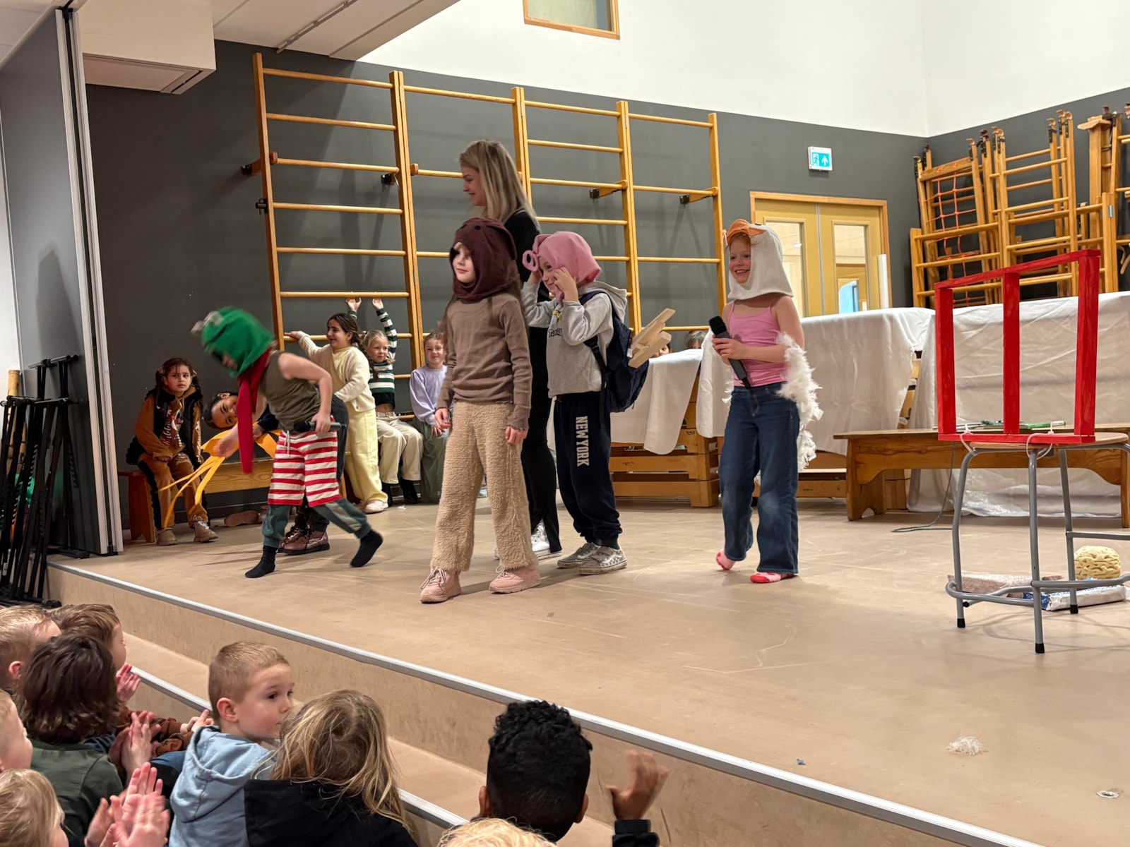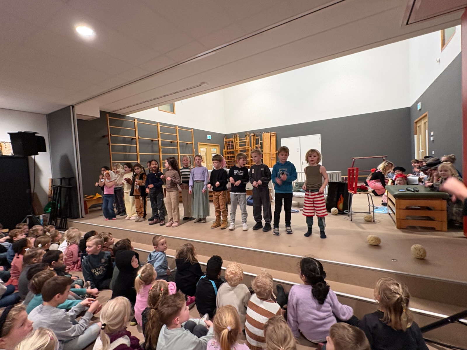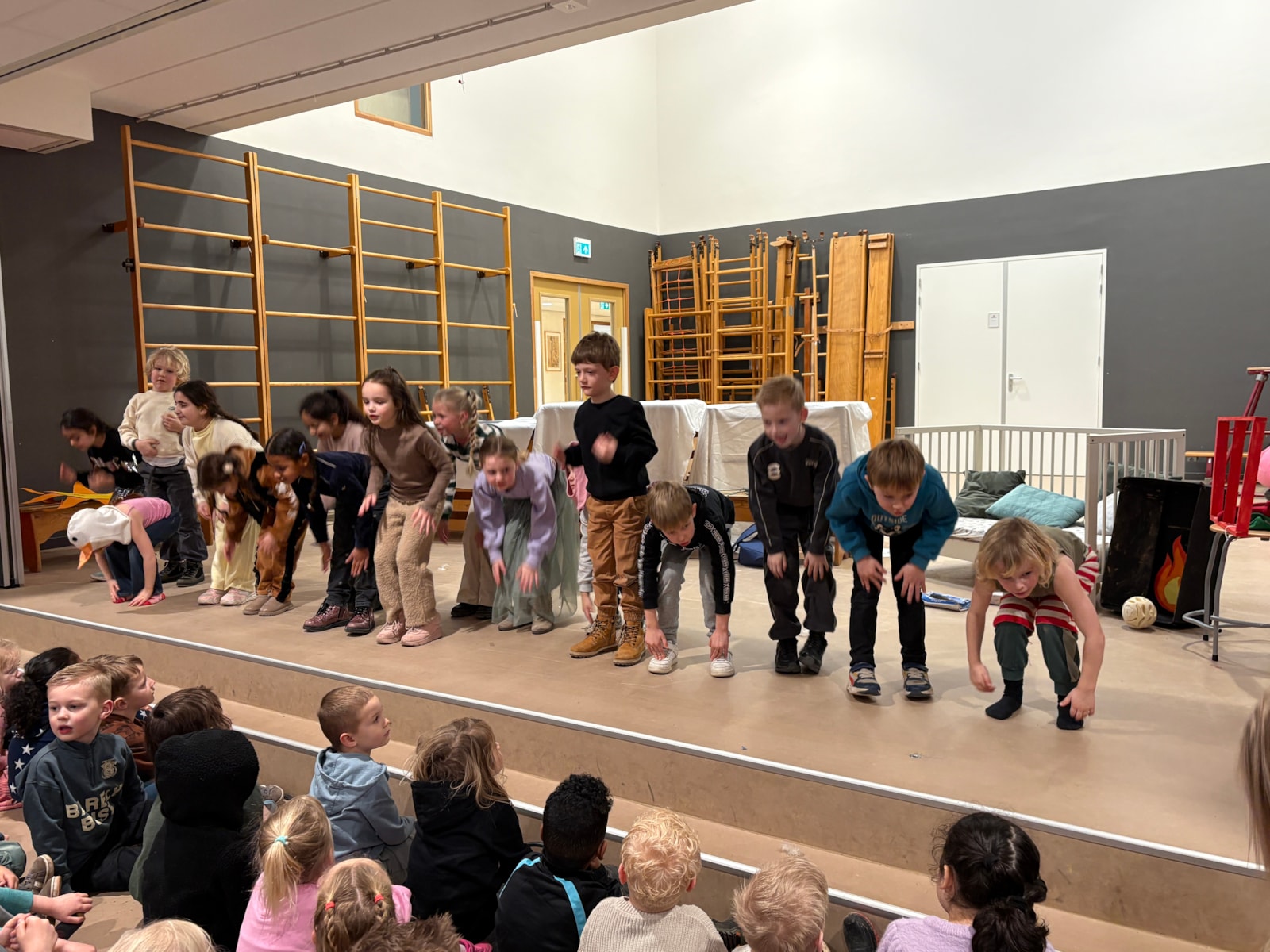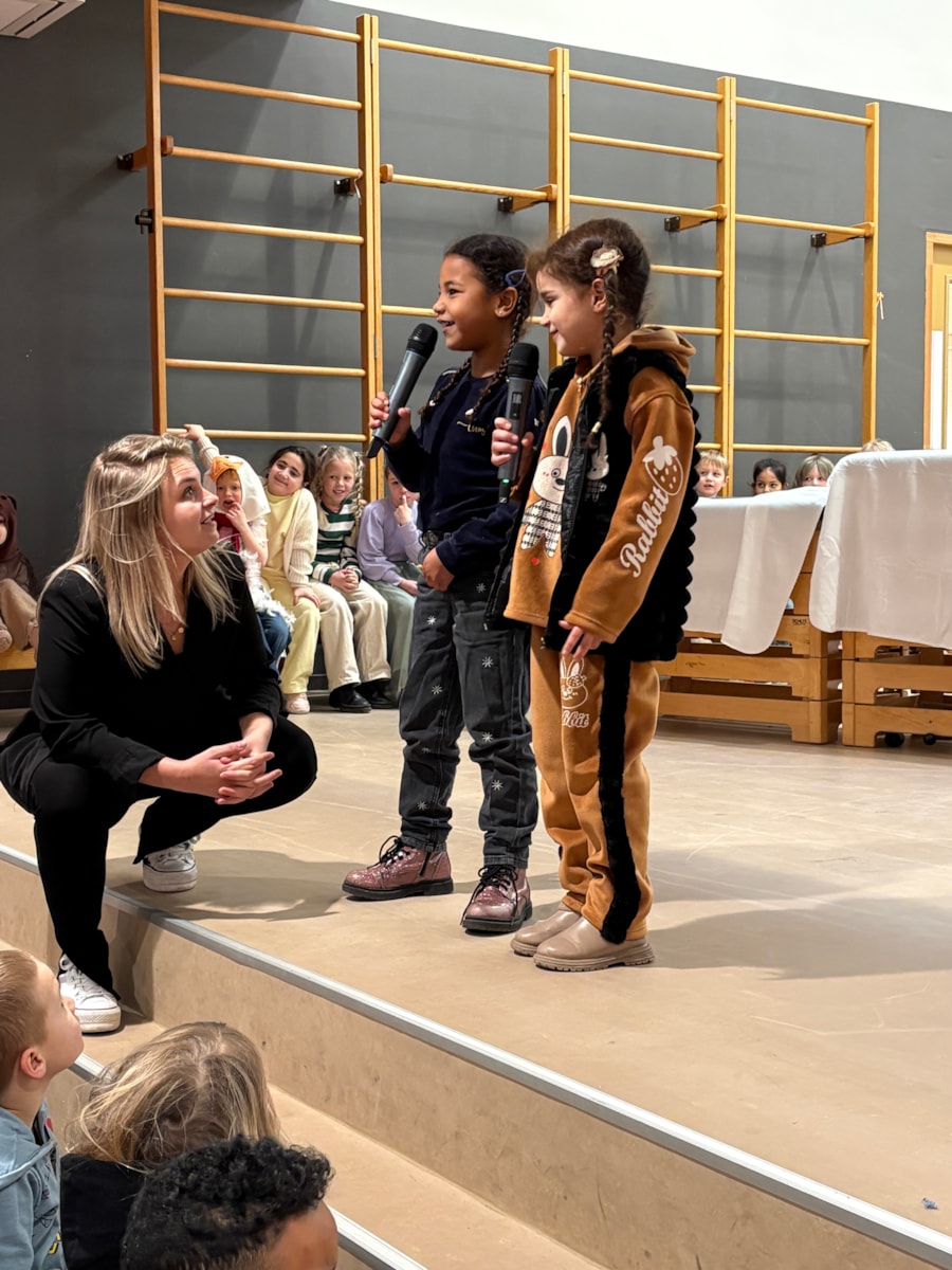 Wauw! Wat een kanjers! Daar stonden ze dan: de kinderen van groep 3 en 4 op het podium om een voorstelling te geven voor alle kinderen van De Fontein én voor alle papa’s, mama’s, opa’s, oma’s, broertjes en zusjes!